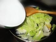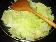 先下白菜帮大火翻炒,再下叶子,用大火一起翻炒至柔软出水。