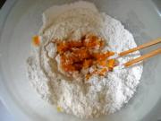 取面粉200克与叮熟的南瓜混合,用开水烫面、和匀。