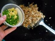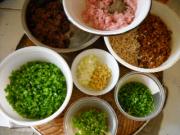 猪肉、牛肉剁馅,分别用盐、淀粉拌匀;花菇、香干、韭菜花、青椒、香菜、姜、大葱均切细粒备用。