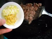 锅中油烧热,下牛肉滑散,倒入姜、大葱翻炒均匀。