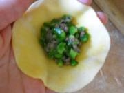 擀好的饺子皮包入馅料。