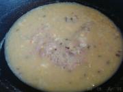 将咸鸭蛋的蛋黄取出,放入小碗,用勺子压碎,加少量料酒搅拌下。