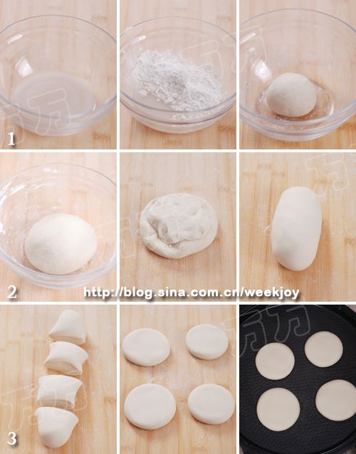 3.揉好的面团分割成合适的大小,4-6份均可。然后每份分别揉圆,如图用擀面杖擀成厚度小于1cm的面饼。电饼铛烙约2-3分钟至两面微黄,约八九成熟即可。