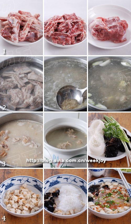 B.羊汤:羊大骨500g,羊脊骨500g,羊腿肉500g。八角1个,桂皮一小块,葱白几段,姜几片。