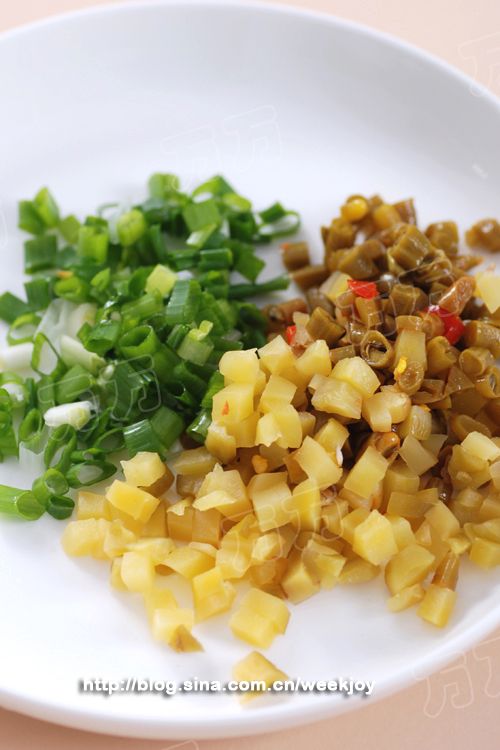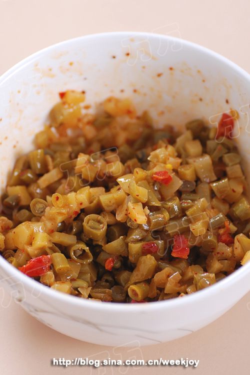 5.喜欢吃辣的,可以把榨菜和酸豆角里拌入辣椒油或辣椒酱。