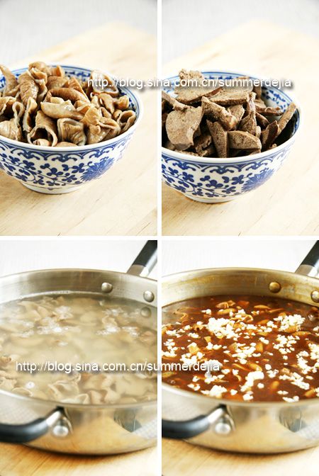 做法: 1、将肥肠处理干净,放入锅中,加料酒、花椒、大料、桂皮、小茴香、葱、姜,煮30分钟,捞出晾凉,切小段;(肥肠的处理方法在这里:尖椒炒肥肠) 2、将猪肝切薄片,用清水反复冲洗至无血污,放入刚才煮肥肠的锅中煮熟,捞出;(猪肝的处理方法在这里:尖椒胡萝卜炒猪肝) 3、锅中倒入开水,放入肥肠段、炒肝片; 4、一小碗干淀粉加少许水搅成糊状,加老抽上色、生抽、盐、糖、鸡精调味(可加少许干黄酱调汁),倒入锅中,调成糊状,多撒些蒜末出锅即可。 提示: 1、没有吃过北京炒肝的外地人一般很难理解炒肝是个什么东西,所谓炒肝并不是炒的,而是煮出来的,而且除了肝,还有肥肠,肥肠一般还比肝更多一些。但是我觉得最后放淀粉,因为比较浓稠,要不停搅拌,还是挺有“炒”的感觉的; 2、这里介绍的是适合家庭的做法,比较专业的做法一般是用原汤滤去杂质煮,自己家做还是喜欢弄得干净些,另外放开水煮的,也可以加一点蘑菇汤煮,没有不放也可以了; 3、猪肝也可以整个煮再切薄片,我觉得那样浸泡不干净,又浪费时间,,还是切完薄片再煮的; 4、外面卖的炒肝可没这么多料,我这一碗够做外面十碗的了,不然外面亏大发了。这东西胆固醇太高,最好不要吃太多。