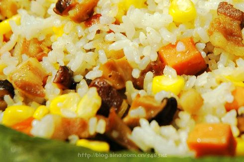 PS: 1.烫荷叶的水里滴两滴油,以加助保持荷叶的色泽。另外,烫的时间一定要短,马上丢下去马上拿出来。 2.因为火腿肠本身就有咸味,所以盐一定要在它下锅前加。 3.荷叶饭里的内容基本上是想加什么都行哈。