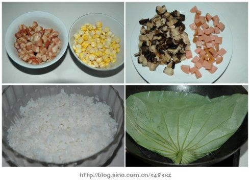 入夏以来,一直都有想做个荷叶饭,荷叶粥什么的。可在武汉,能找到新鲜荷叶的地儿也就只有公园了。那个,虽然咱曾几度在风高月黑的晚上,偷偷在公园的荷花池边徘徊。 可。。。 最终也还是没有勇气伸出魔爪。。。 哎。。。! 再说,某天,好心态前辈做了那个钩魂的荷叶蒸排骨。看着图片,我都差不着能滴一地的哈喇子。好吃佬啊,就这点出息。吼吼,自我反省下。。。 正好在这档儿,某阳光丽人约我周末去郊区采莲蓬,哈哈哈。。。机会来了!我是去不了了,不过在咱的诱惑逼迫+恐吓下,那有良心的总算是给弄了四张荷叶来。 哈哈哈。。。 当晚,就先来个荷叶饭解解馋! 材料:荷叶,五花肉,玉米粒,香菇,火腿肠,姜末,生抽,料酒,盐 步骤:
