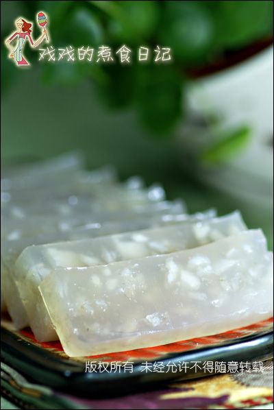 生熟浆倒入你想做成任何形状的容器里,在容器的底部涂上一层色拉油,好方便冷却后取出。