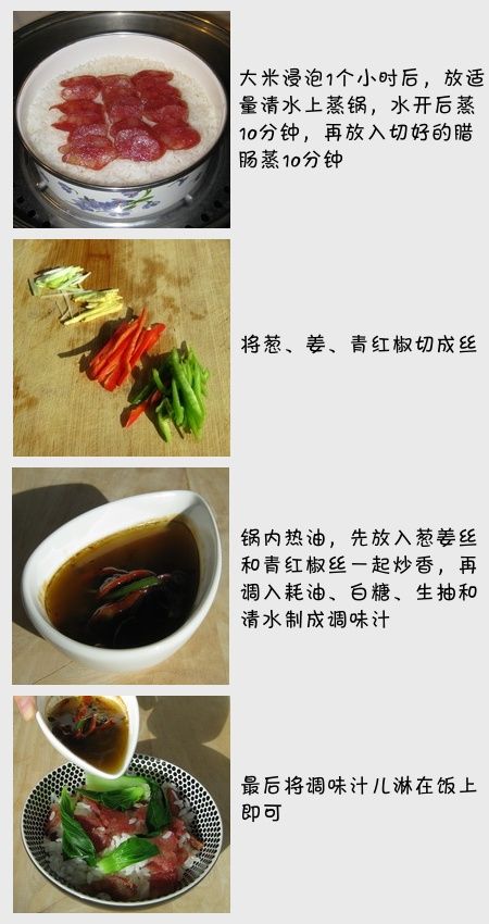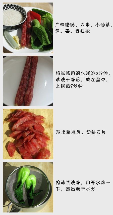 若干年前,我曾经在广州工作生活过一段时间,对那里的干炒牛河、马蹄糕、虾饺、鱼腩粥、姜汁撞奶、腊肠饭等粤式茶点尤其喜爱。到北京以后,我在顺峰、金鼎轩等粤式餐馆也品尝过这些广式茶点,但感觉味道和气氛总是差那么一点。今天干脆在家亲自做一个腊肠饭,一样的惹味啊!