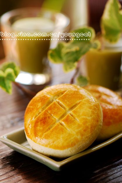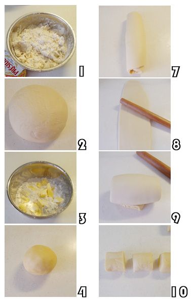 豆沙馅老婆饼(约17-18个) 材料: 油皮材料:高粉125克,低粉125克,糖粉50克,盐2克,无盐黄油100克,清水95克 油酥材料:低粉250克,无盐黄油125克 豆沙馅:约700克(最好自己做,市售的豆沙都过甜,做法很简单,将红豆煮烂,用勺子再尽量搅烂,收尽水份,依自己的口味加入冰糖和桂花酱即可) 蛋黄适量 做法: 1、将油皮材料中的高粉、低粉、糖粉、盐和匀,加入黄油和匀 2、分次加入水,揉成光滑面团,醒20分钟 3、将油酥材料中的低粉与黄油和匀 4、揉捏成油酥面团 5、将油皮面团与油酥面团分别擀成牛舌状,将油酥面皮放在油皮面皮上面,擀合 6、如图六将擀合的面皮卷起 7、将面卷竖放 8、如图8再擀成长牛舌状 9、如图9再卷起,重复7-9步两次 10、 11、 12、 13、