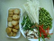 将各式材料洗净,金针菇切去根部,香菇切片,青红辣椒切丝,葱切段。
