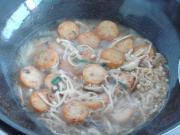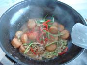 北海道鲜贝煮至发胀后加青豆翻炒数下。