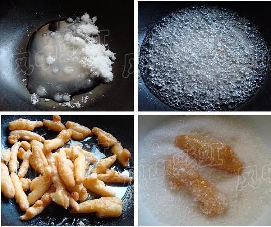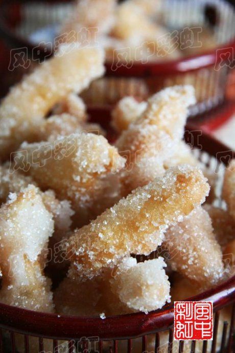 **************** 江米条 ******************** 材料: 糯米粉(即江米粉)..........1斤 水..........................6-7两 麦芽糖......................3两 装饰用砂糖.................少许 做法: 1、将麦芽糖倒入水中混合,倒入锅中烧开 2、糖水沸腾后,倒入2/3的糯米粉,和均匀 3、离火,再加入剩余的1/3生糯米粉,和成面团 4、将面团擀成厚片,切成约1厘米宽的长条,分别搓成约筷子粗的圆棍,再切成小段 5、准备炸:在锅中放置一个漏勺可防沾连 6、小面条凉油下锅,随着油温慢慢升高,小面条会慢慢浮起,用漏勺轻轻翻动,过程中油温不能太热,不要超过120度 7、炸至面条呈金黄色即可捞出控油,约12-15分钟(可以晾凉后直接吃) 8、表面沾糖:锅中倒入小半碗水,再倒入约等量的白糖,煮至糖水起大泡泡,略黏稠 9、将炸好的江米条放入糖水中均匀地沾上糖液,再放入白砂糖或椰蓉中滚一滚,沾满糖 10、待糖晾干即可(高糖食品,不要一次吃太多哦)
