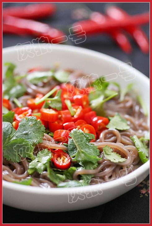 原料:蕨根粉100克、新鲜小辣椒5个、香菜2棵、醋4茶匙、盐1/4茶匙、生抽1茶匙、香油1/2茶匙
