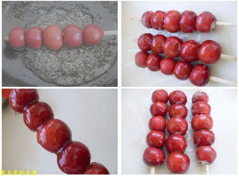 2、蘸糖这个环节看似简单,但很需要技巧。如果糖裹得太厚,吃下去一口咬不着果,是比较失败的。糖要蘸上薄薄而均匀的一层,即算成功。