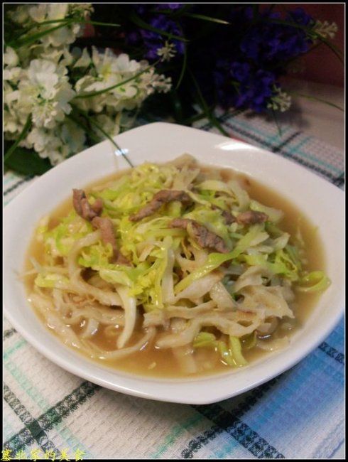 2、圆白菜洗净,切丝;猪瘦肉切丝,加料酒、淀粉,抓匀。葱切丝,姜切丝。