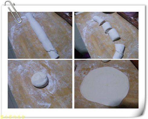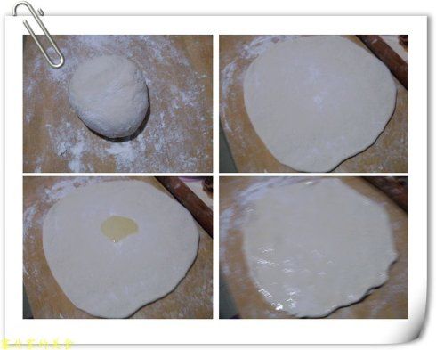 4、把面团按扁,用擀面杖擀成薄片,用刷子刷上油。