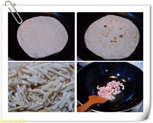 8、把烙好的饼切成大小均匀的粗饼丝。