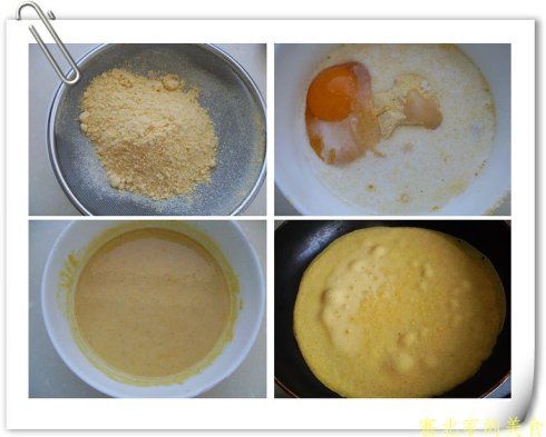 原料:玉米面 白面 鸡蛋 做法: 1、玉米面3杯,过一下筛;白面一杯。 2、鸡蛋打入装有玉米面和白面的碗中,加水,搅拌均匀。 3、放置在温暖处,自然发酵12小时。 4、发酵后的面糊,加白糖,搅拌均匀。 5、平底锅置火上,放一点油,把面糊倒入锅中,迅速转动锅体,使面糊铺满锅底,烙至两面金黄即可。