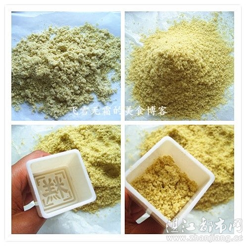 绿豆粉60克、普通面粉80克、植物油46克、白糖35克、豆沙馅少许、表面刷芝麻油少许