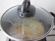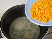 将鱼汤倒进处理过的新汤锅中,倒进青豆和玉米小煮一会儿。