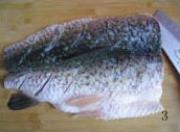 草鱼去头尾,去掉鱼腥线和腹壁黑膜,切成两片,不要切断(头尾烤之前摆在两头一起烤即可)。