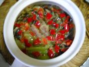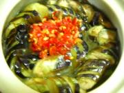 砂锅中加水(高汤更好),舀2勺红剁椒在茄子上。