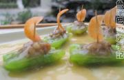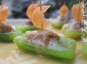 锅中注入适量的清水,大火煮开后放进酿好肉胶的莴笋。