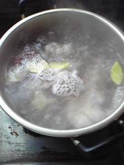 这个骨头汤也是我自己做的,先把骨头放入水中煮开,然后在把骨头洗净。锅里换新水,在放入骨头,葱段,姜片,盐,酱油,味精。大火烧开转小火,煮一个小时就可以了。时间太短味道进不去。