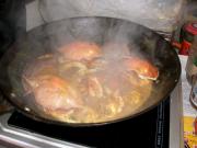 放入盐,糖少许,葱姜,料酒适量,咖喱油等调料,开大火翻炒,倒入开水只要和螃蟹齐平即可,待开后调中火,待水快要干的时候,放点味精翻下即可出锅。