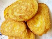 准备一干净平底锅,倒入适量花生油,待烧到5成热,放入均匀裹满蛋液的双色卷,小火煎制,待一面上色后翻面。