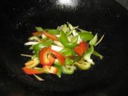 锅热下油,先将蒜白,姜丝,青红辣椒炒香。