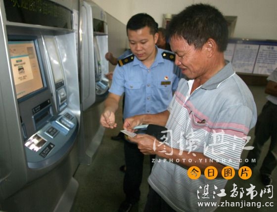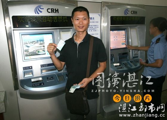 为减轻旅游高峰期和节假日期间的购票压力,湛江火车站配置安装的两台自动售票机于今天开始投入使用,旅客不用挤着排队,一分钟就可以自助买到火车票。