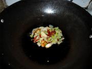 油锅烧热,下入蒜瓣,一定要先下蒜,炒出蒜香之后再下葱和干红辣椒爆香。