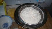 将油、打散的鸡蛋、细砂糖20克在碗里混和均匀。面粉和泡打粉、小苏打混合均匀,过筛。