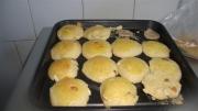 将小圆球压扁、表面涂一层蛋液,放入烤盘。我用的带烧烤的微波炉。大约10分钟左右,要自己多看看,要不然就糊了。哈哈。