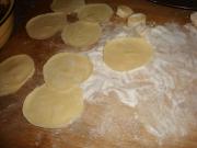 面团搓成长条,切成小剂子,擀成中间略厚,四周略薄的圆片。
