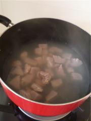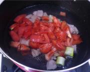 重新放上冷水,将牛肉块,西红柿丁,葱姜放进锅中,大火熬开。