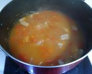 开锅后小火,将盐、番茄酱适量放入锅中,由于番茄酱内有味精所以味精就不加了,下火炖一个小时左右。
