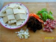 豆腐切1厘米厚的片。猪肉切片。胡萝卜,尖椒切菱形片。木耳撕成小朵。葱姜蒜切片待用。