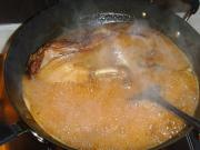 加入适量水,没过鹅的2/3即可,加入老抽、生抽、蚝油、盐、黄糖、酸梅酱调味,大火煮沸中火焖四十分钟左右。