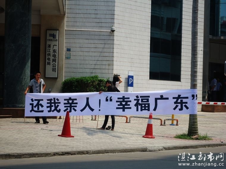 今日路过湛江电力公司门口,只见四人拉出“湛江电力,还我亲人”、“还我亲人,幸福广东”的标语,围观者众,不敢独享,发上网上来求真相,有指导真相的群众八一八呀!