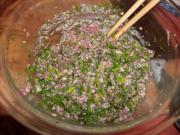 调馅是关键的一步。把肉馅用两杯水稀释、牛肉馅吃水。然后加入盐一小勺、植物油二勺、海鲜酱油一小勺、十三香少许。撒上葱末顺时针搅拌。最后加茴香末。