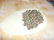 这一步是擀皮。把面揉成长条、揪大一点的剂子、擀成薄饼。再把肉馅摊在饼的一半上面、用手扑匀肉馅。