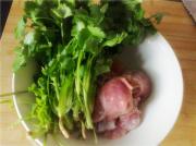 2、香菜洗干净在锅内走一下油捞出摆盘,辣椒切碎。