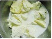 cream cheese切成小块,加入牛奶浸泡30min。无盐牛油隔熱水坐溶。