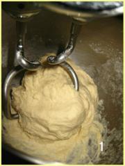 高筋粉和低筋粉放在一碗里,搅拌均匀,放在一边。先将水加温(手感觉暖就可以了),加入酵母、糖、全蛋液、奶酪粉在搅拌机容器内,搅拌几下,好让酵母能比较充分地融开,再加盐,搅拌几下,倒入高筋粉和低筋粉,开机先用低速搅拌,再转中速搅拌。