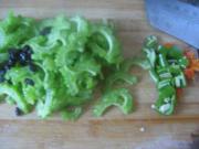 锅内烧油,苦瓜腌出水后挤干水,与青椒,豆豉,干辣椒一同入锅炒。