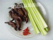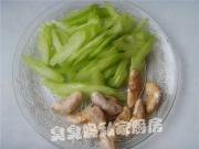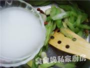 下入西芹、菱角、枸杞、料酒、盐、鸡粉翻炒几下。